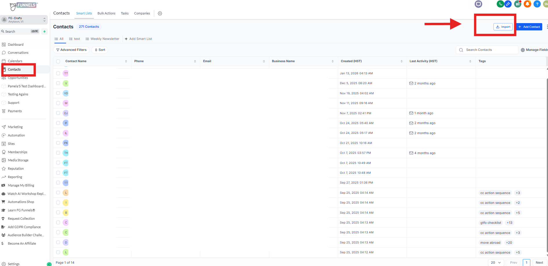 1) Click on Contacts ( on the left side menu ) > Click on the "Import" button at the top right of the contacts section.