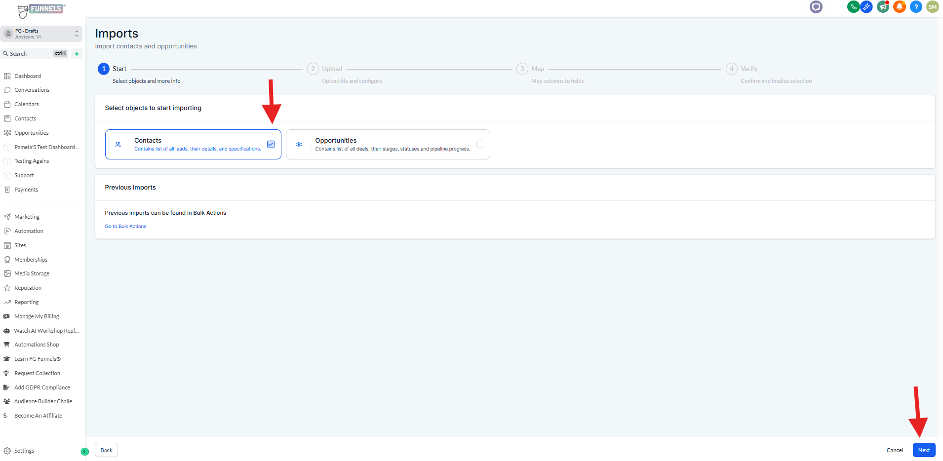 3) Match the fields you are importing to the standard fields in the FG Funnels system. You can do so by clicking on the dropdown menu in the "Contact Fields" column.