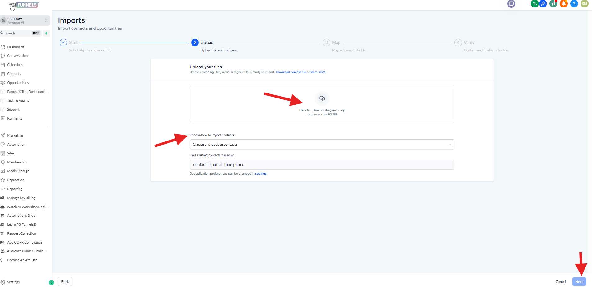 This means that it will create new contacts, and if you have any leads already in the system, it will update them with the information from your CSV file. The system will check for existing contacts in your FGF account based on the unique identifier (Email, phone, or contact id) you selected.