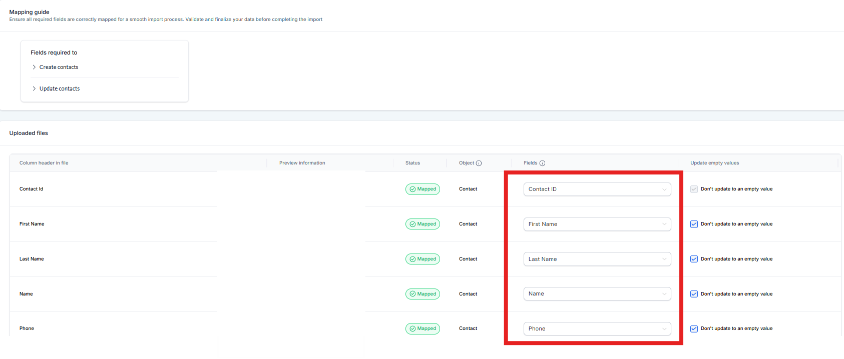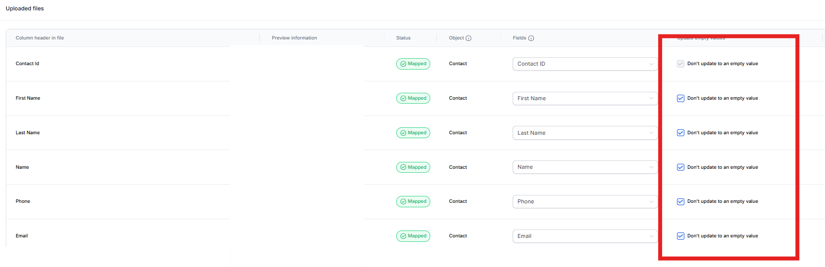 5) Make sure to check the box labeled "Don't update empty values for existing records" when you are importing contacts, which you may already have data on their contact record, and you do not want the system to overwrite this data with an empty field from the CSV file you are importing.