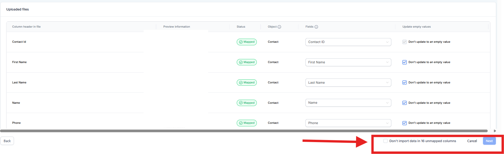 6) [ Optional ] If you do not want to import the data in the unmatched fields then check the box at the bottom that says "Don't import data in unmatched columns" Then click "Next" button at the button.