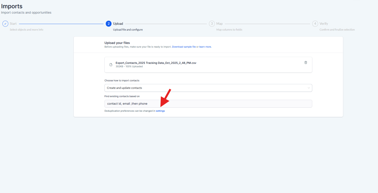 In the "Find Existing Contacts Based on " field, the default identifiers will be what's set in your Business profile's deduplication settings. To change that, click the Settings button