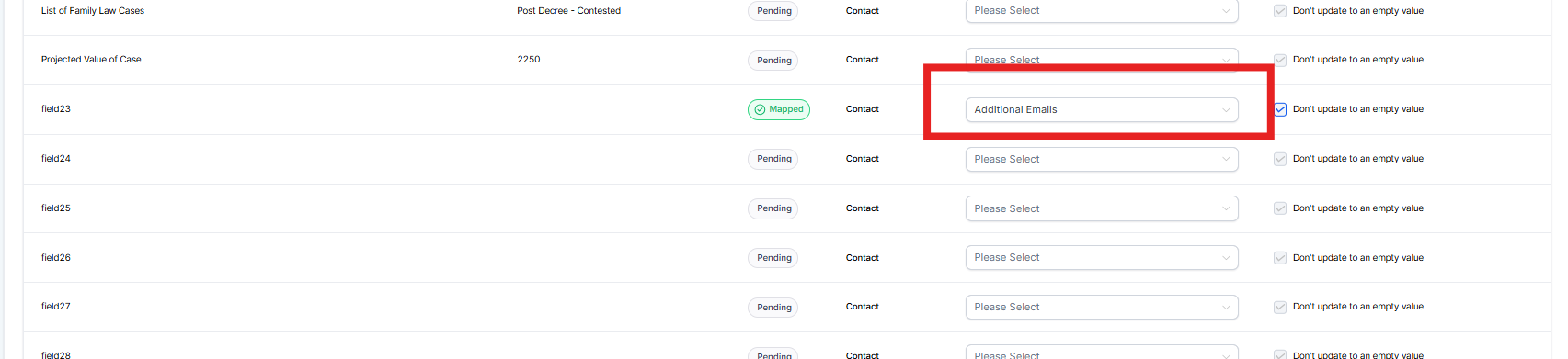 - During the import process, it's necessary to include all additional emails in one column. These should be separated by commas (,), slashes (/), or semicolons (;), and then mapped to the “Additional Emails” field in the system.