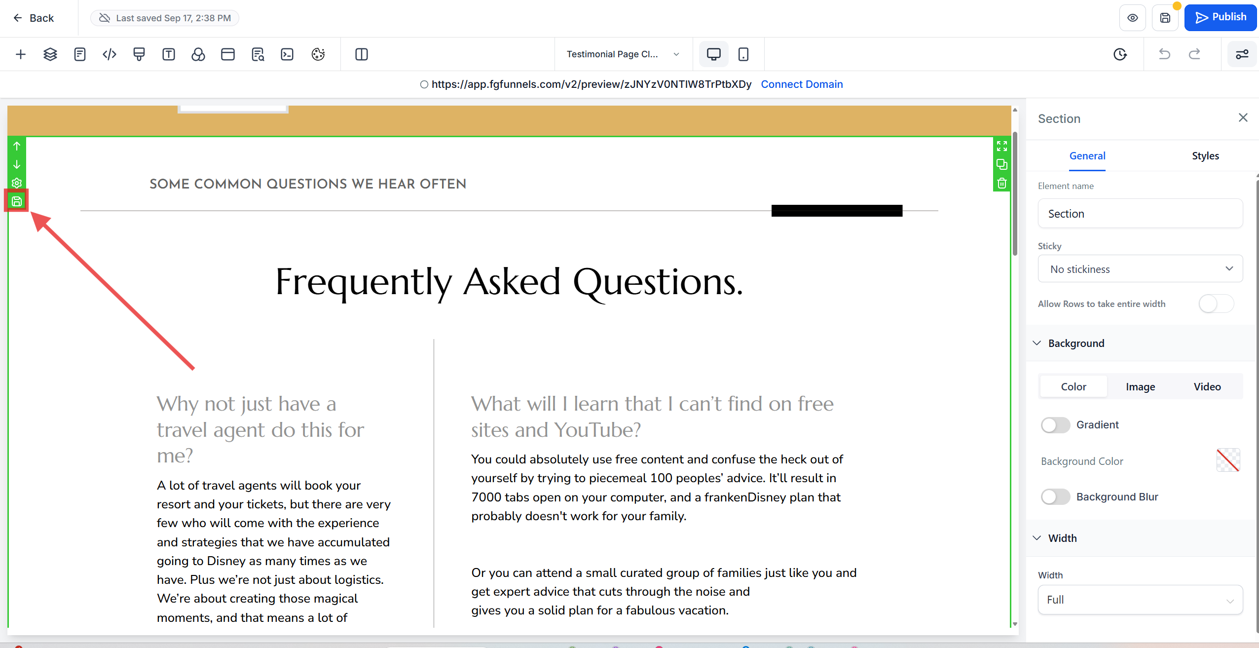 3) You can save a section by clicking on the section, so it is highlighted in green. Then go up to the options in the top left corner of the section and click the save/floppy disk icon. A save modal will appear.