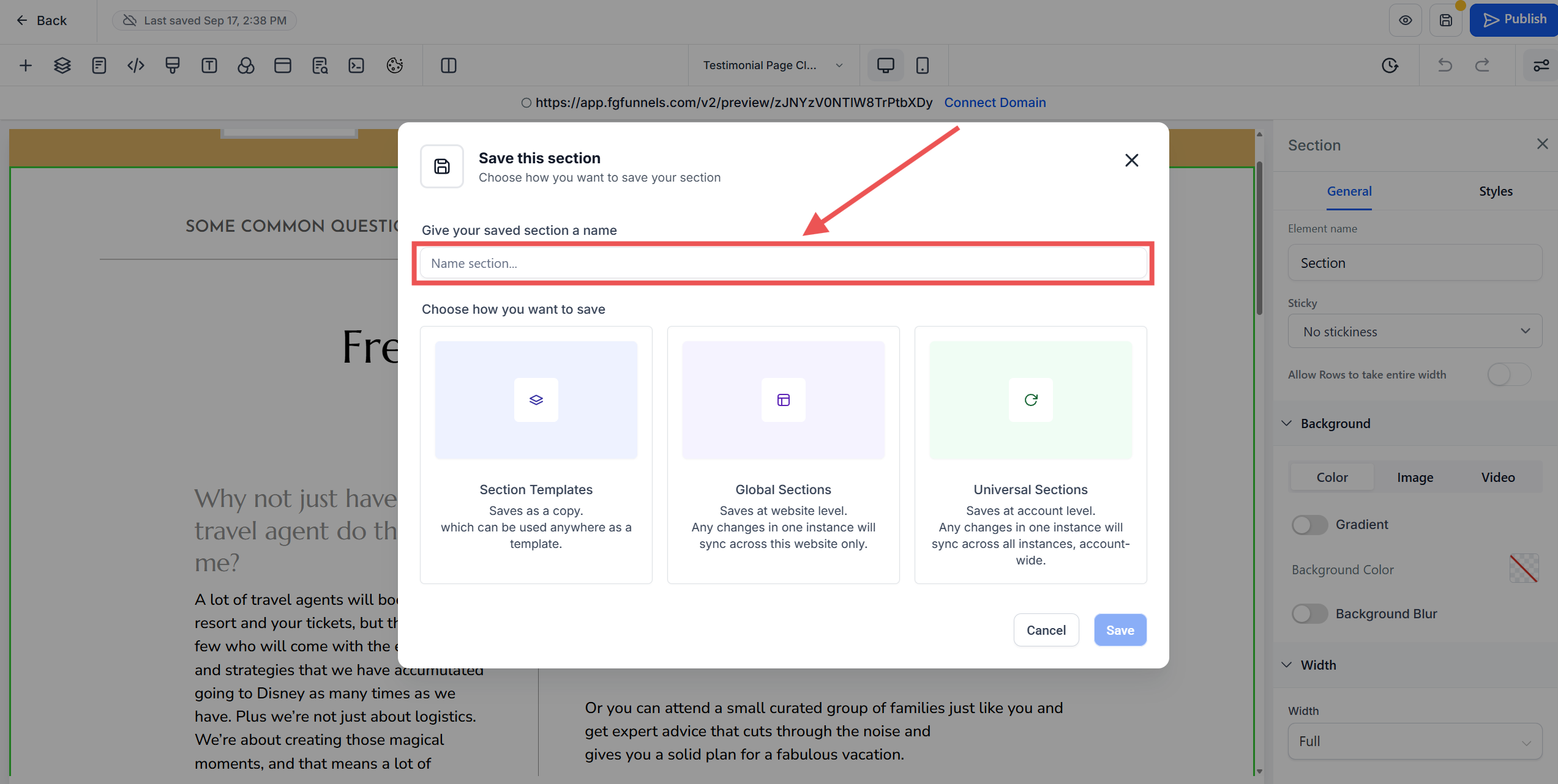 When you go to save a section in FG Funnels, you will be given the option to save as a Global Section or as a Section Template. While they are both ways to save a section, they are very different. This article will explore the differences and use cases for both.