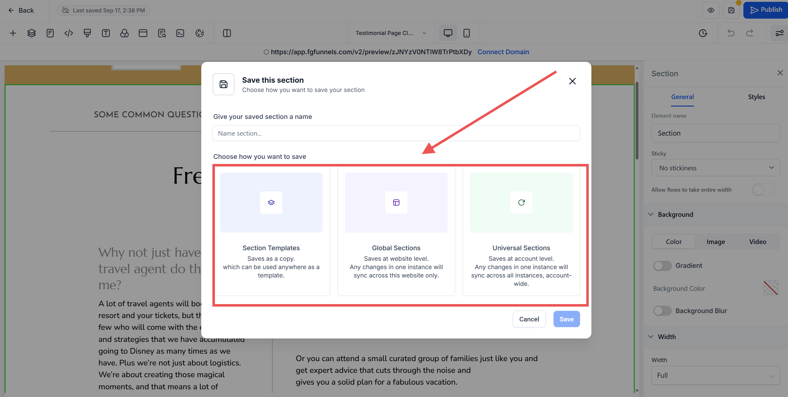 Saved Section Templates allow you to create, save, and reuse content sections across multiple assets, such as funnels, websites, webinars, and online stores, within your FG Funnels account. You can choose between three types of saved sections: Universal (syncs everywhere), Global (syncs within a single asset), and Template (static, reusable, and non-syncing).