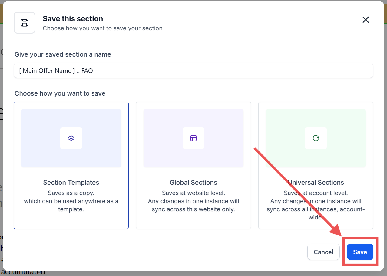 6) Click save and your section will now be saved as either universal, global, or a template depending on what you chose.