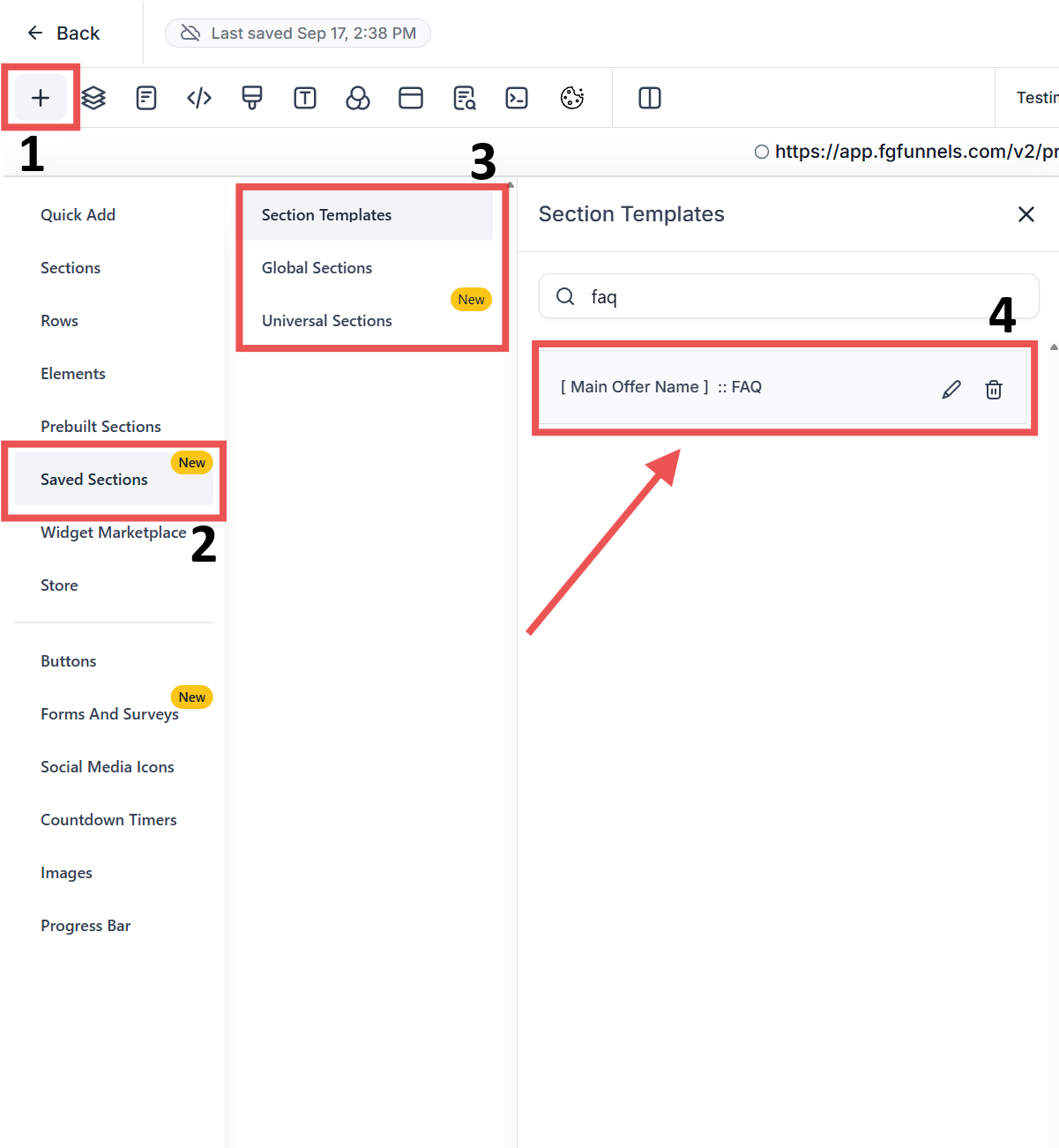 7) When editing another funnel or website page, use the “Add Section” option to browse and insert your saved Universal, Global, or Template sections.