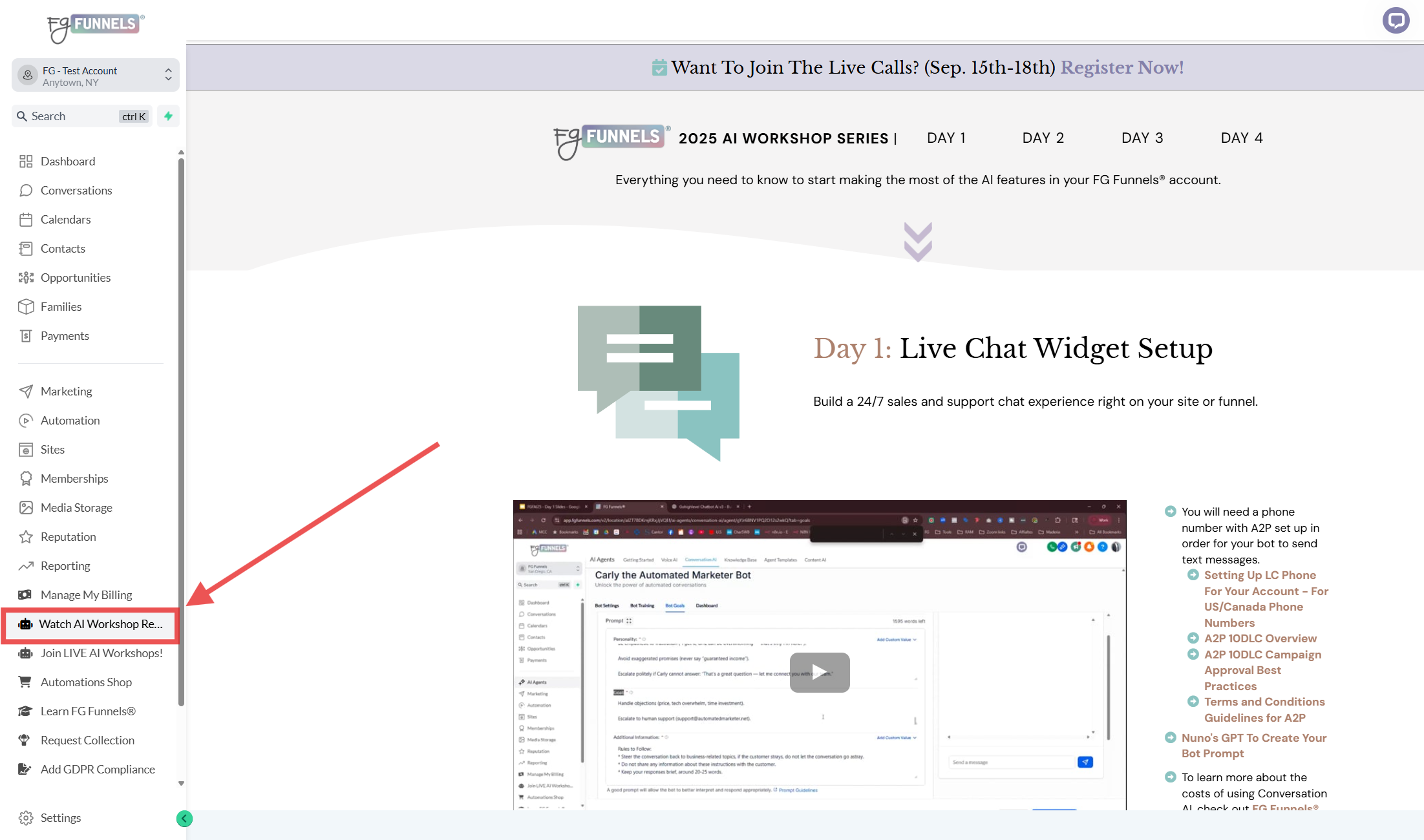 - From the dashboard view, scroll down the left menu and select the "Watch AI Workshop Replays" option there.