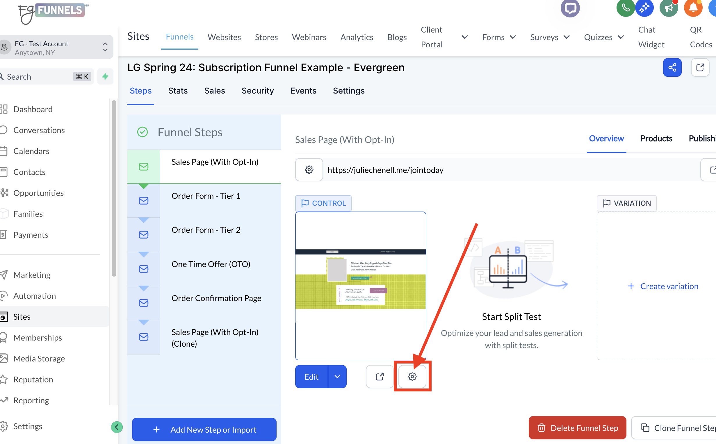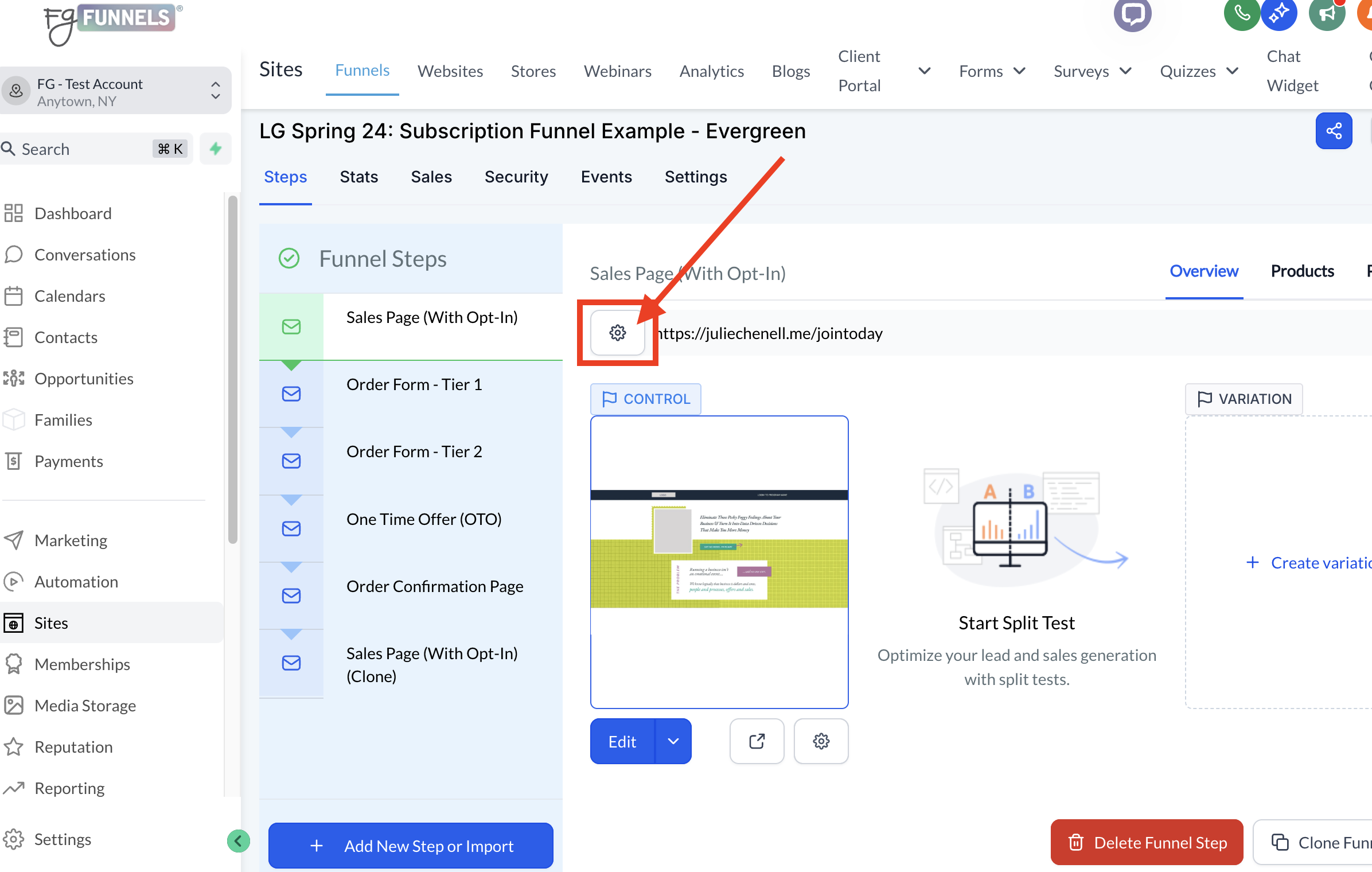 Step 2: Access the Settings for Your Funnel Page