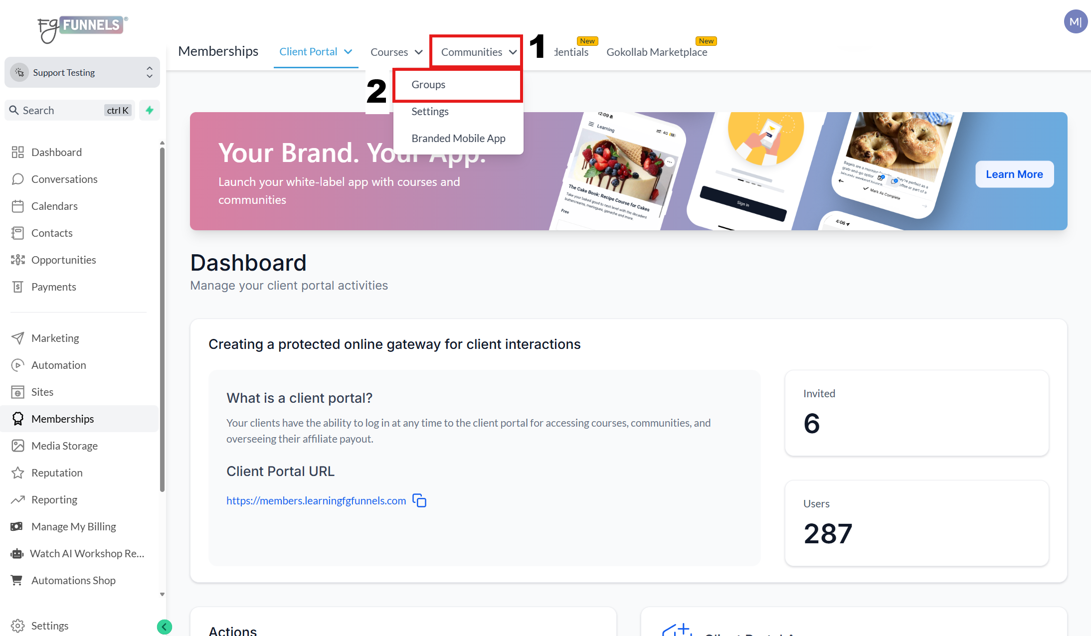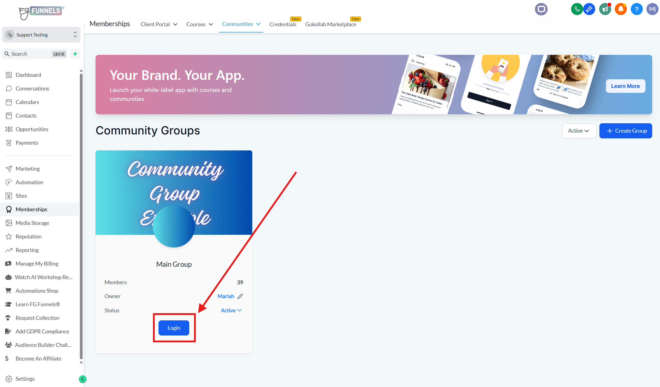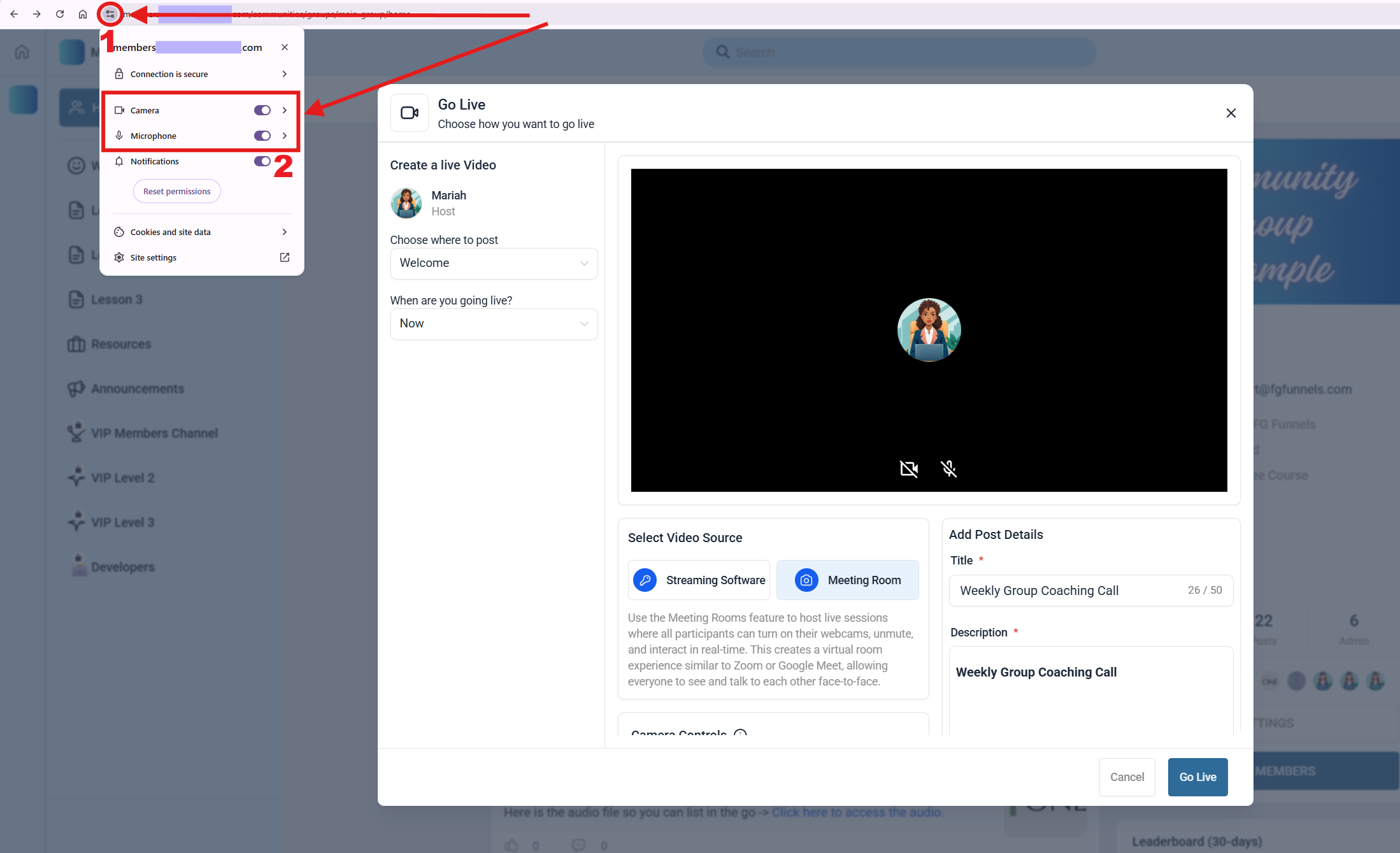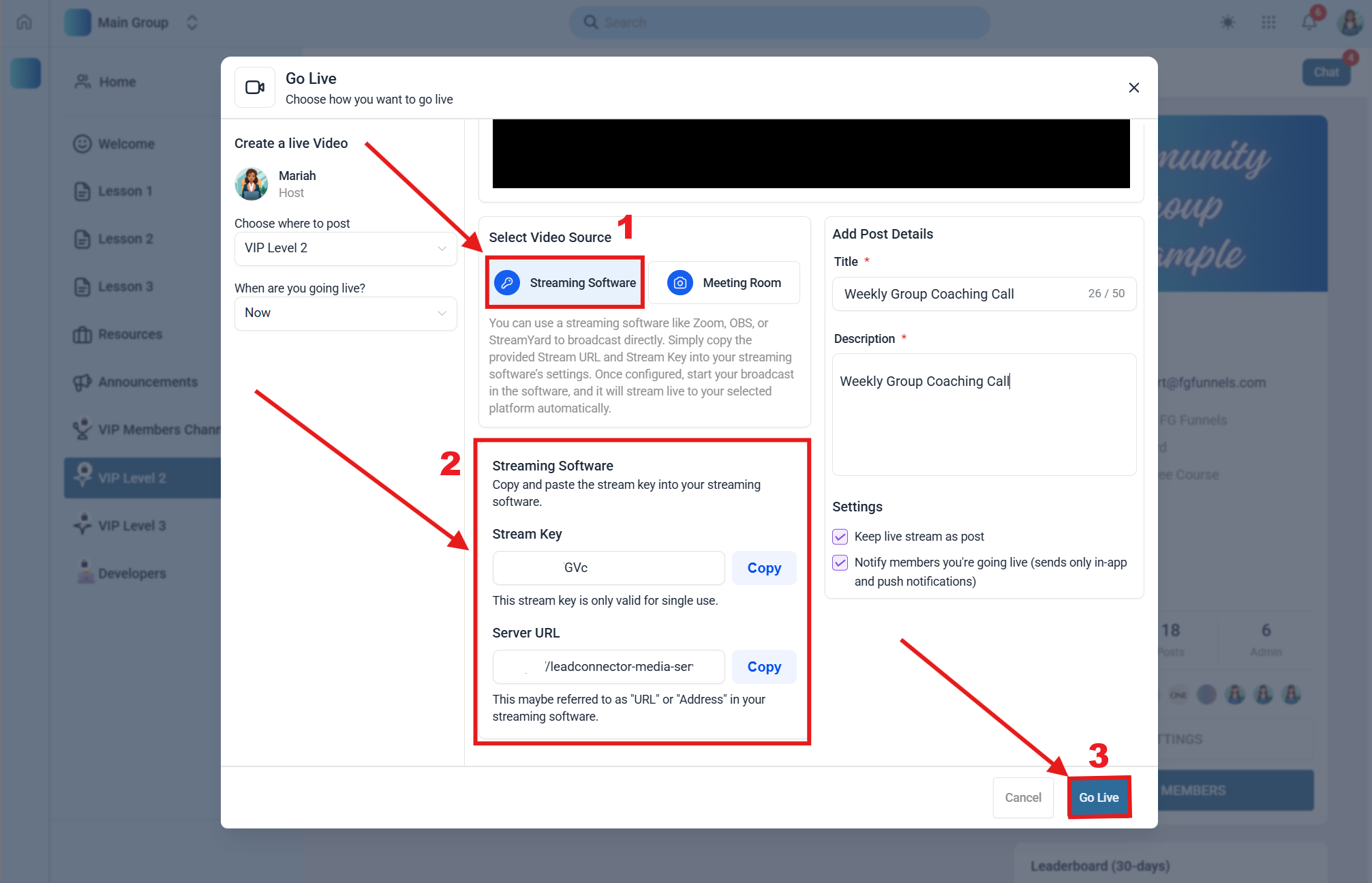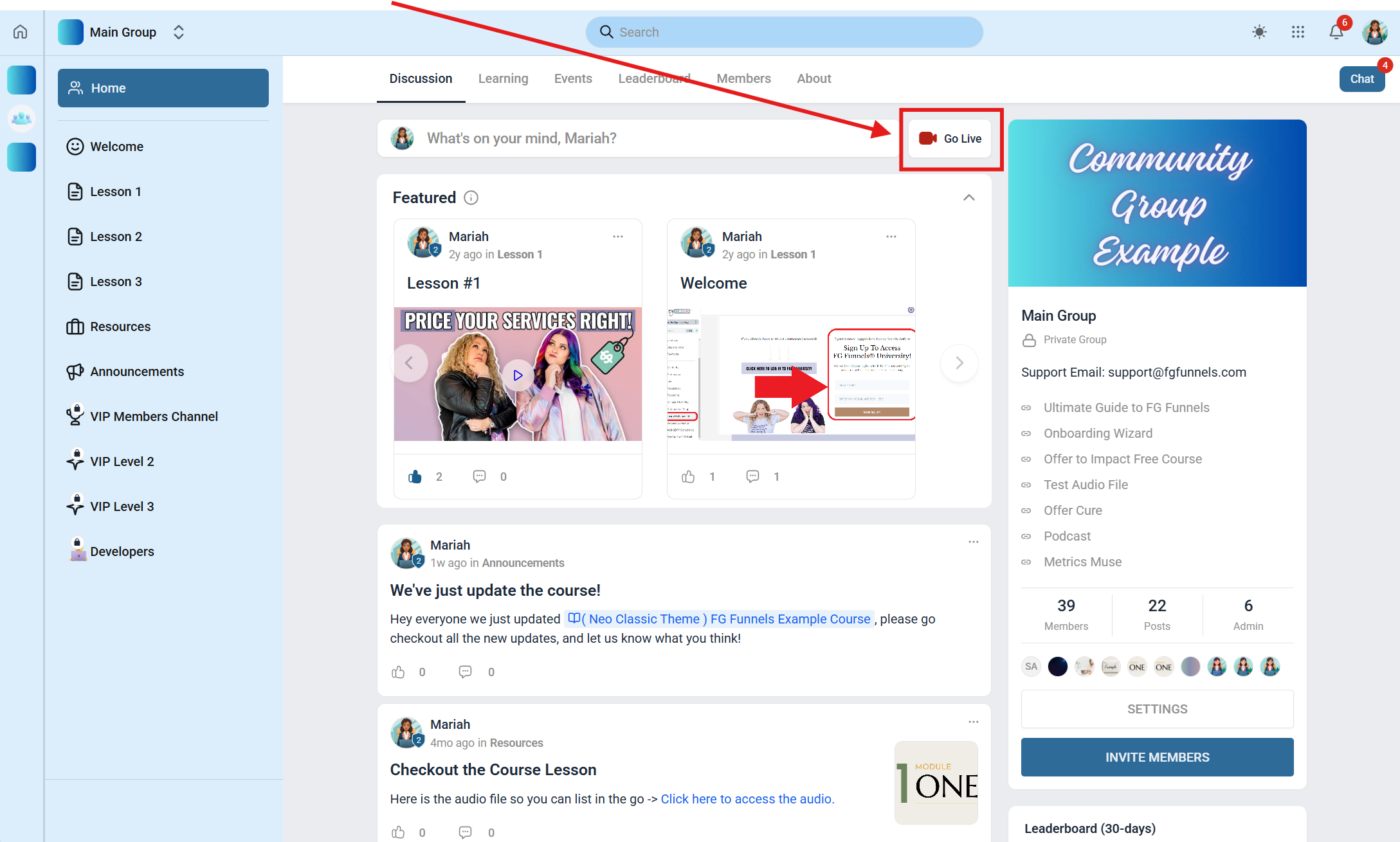 Back in FG Funnels, start the Go live; your broadcast will appear live in the chosen channel.