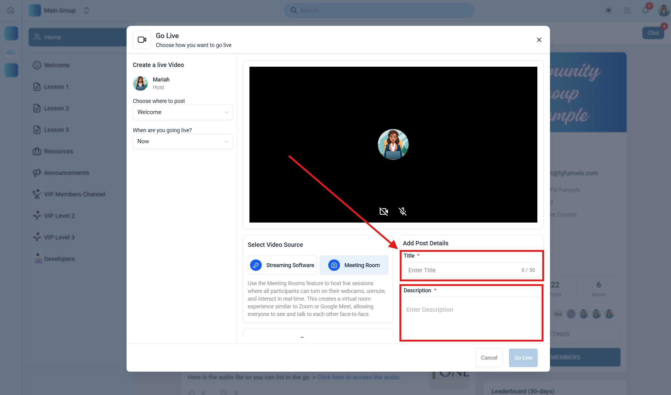 Go Live is a built-in live session experience for Communities. It lets admins host interactive meetings or broadcast a professional stream directly into any group or channel. Members can join instantly, chat in real time, react with emojis, and—if enabled—watch replays later. Because it’s native, you keep attention inside your community and simplify setup for hosts and attendees.