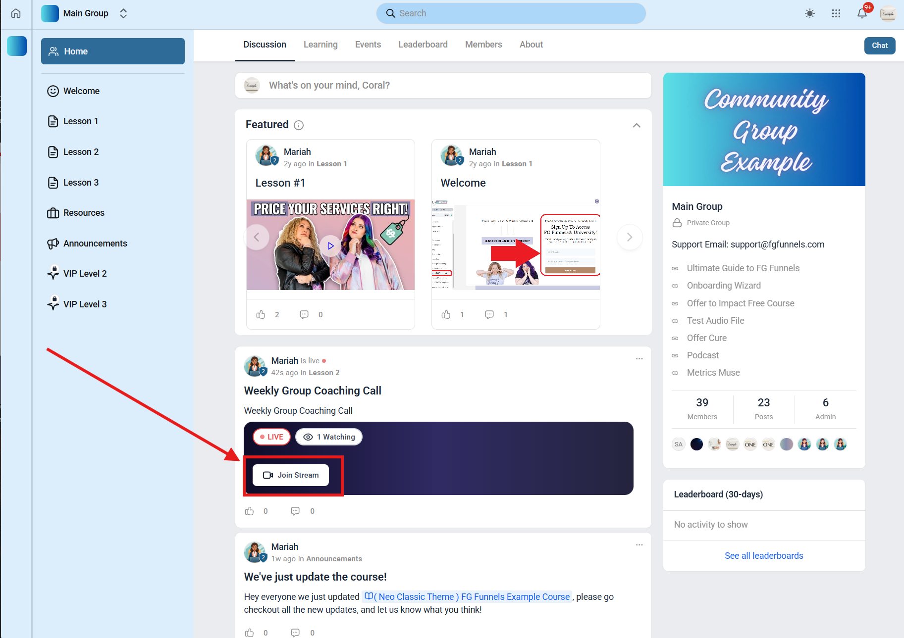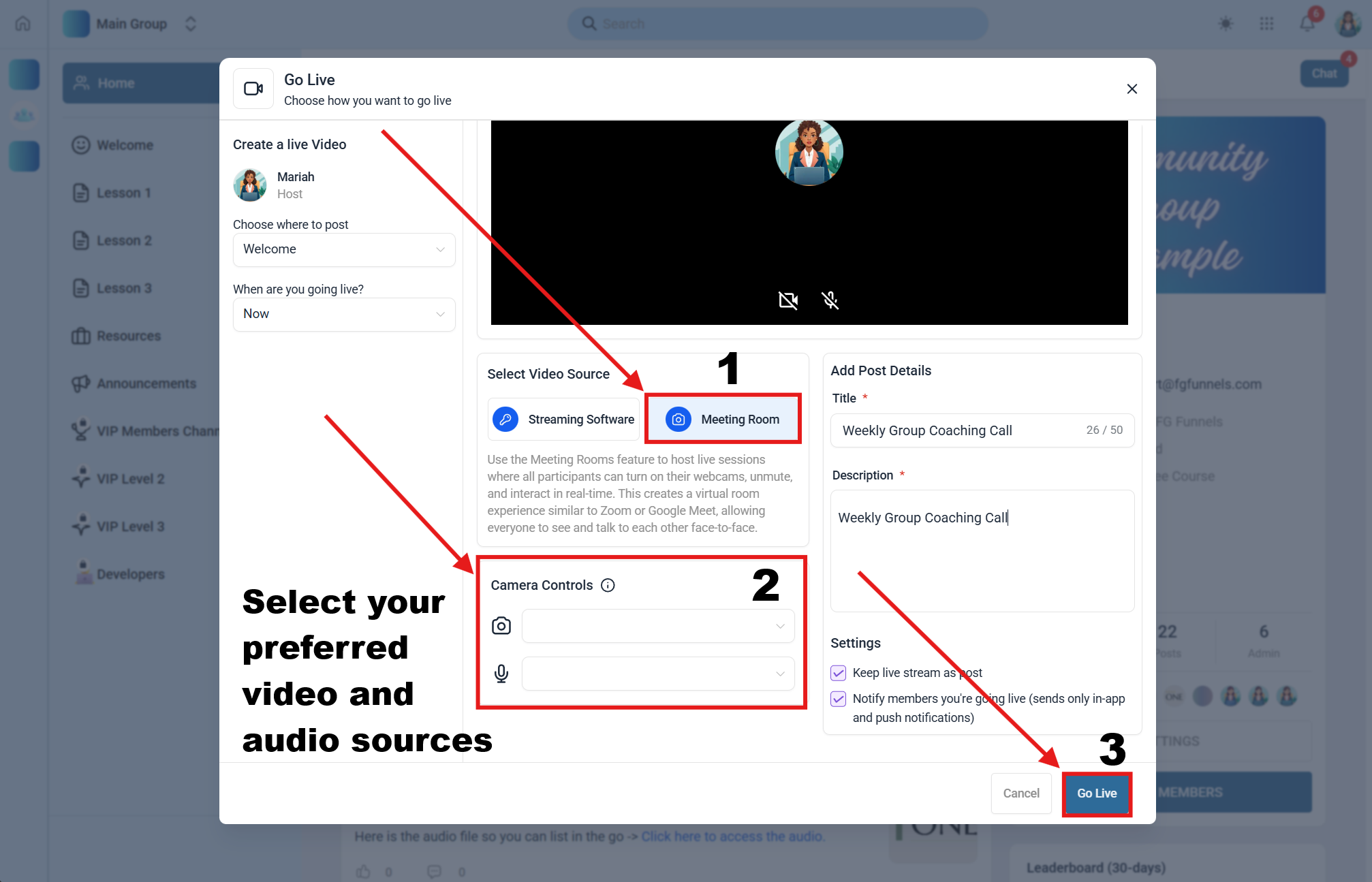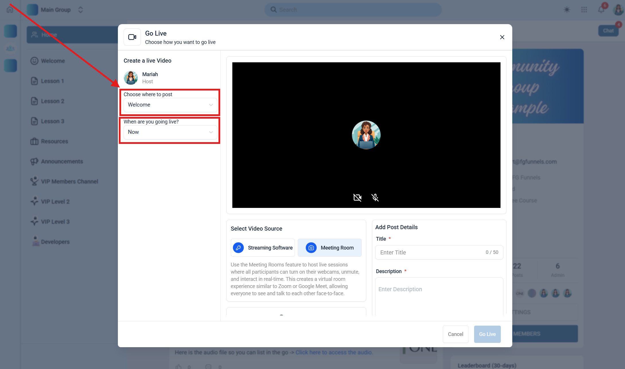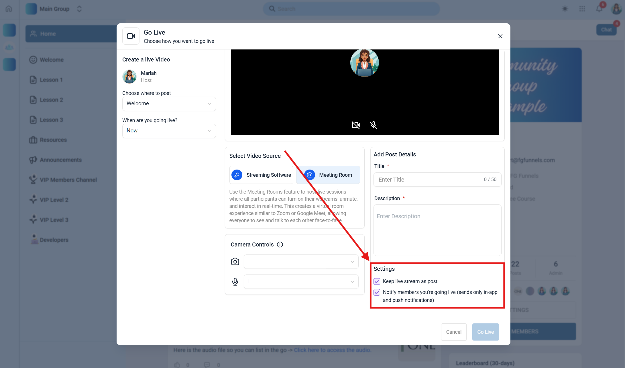 Yes. Host Go Live inside private channels or paid groups so only the right members can join. Pair with Community Events for scheduling and reminders.