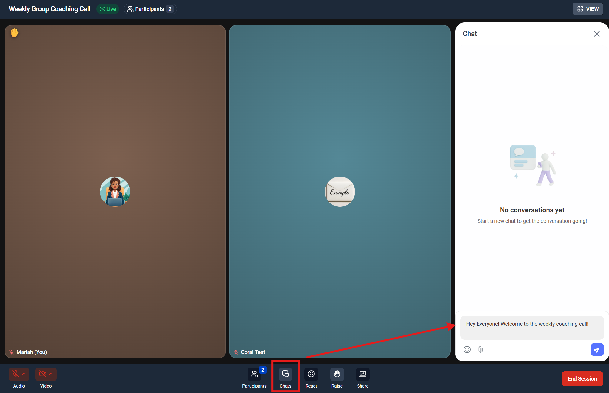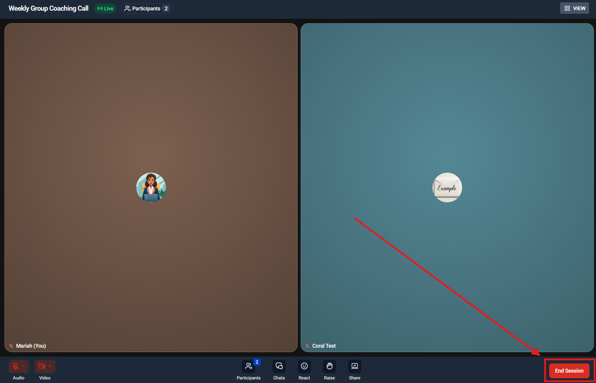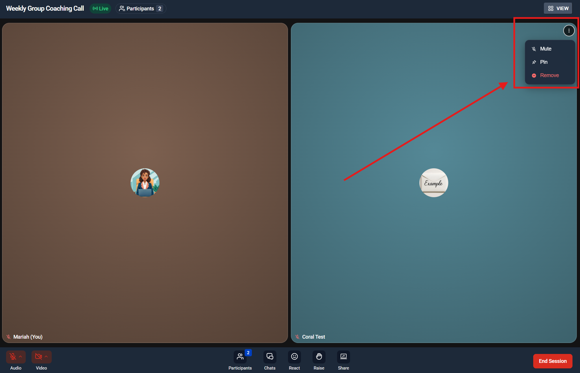 Use Meeting Room Mode when you want face-to-face collaboration—coaching calls, cohort workshops, or office hours. Everyone is present in the same space, with the host managing who can speak, present, or share screens. Highlights:
