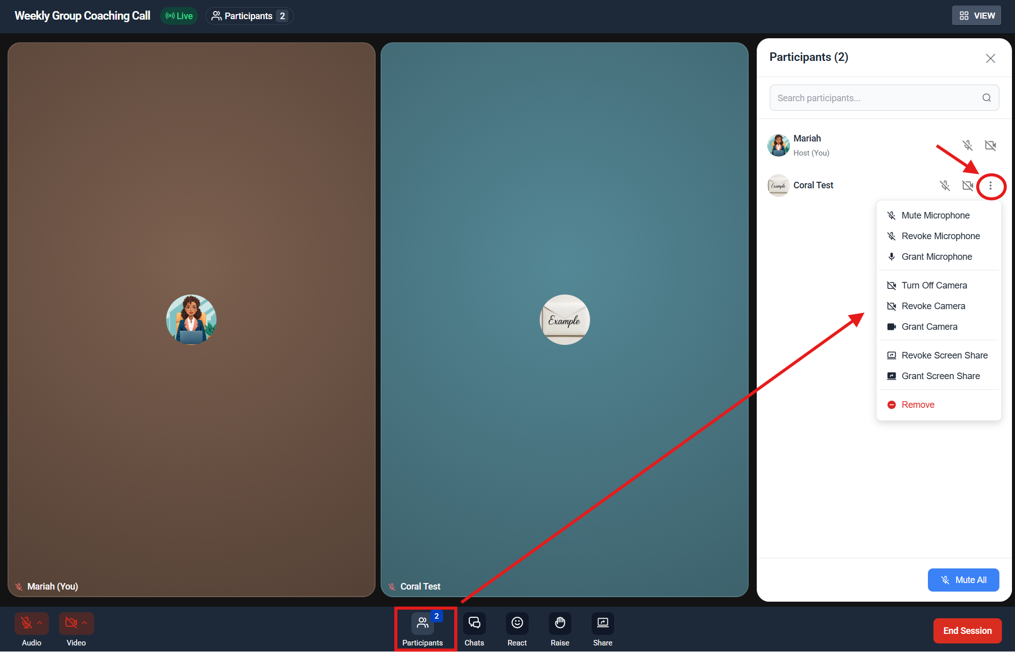 - As Host you can mute/unmute, grant/revoke mic, grant/revoke camera, grant/revoke screen share, or remove a participant.