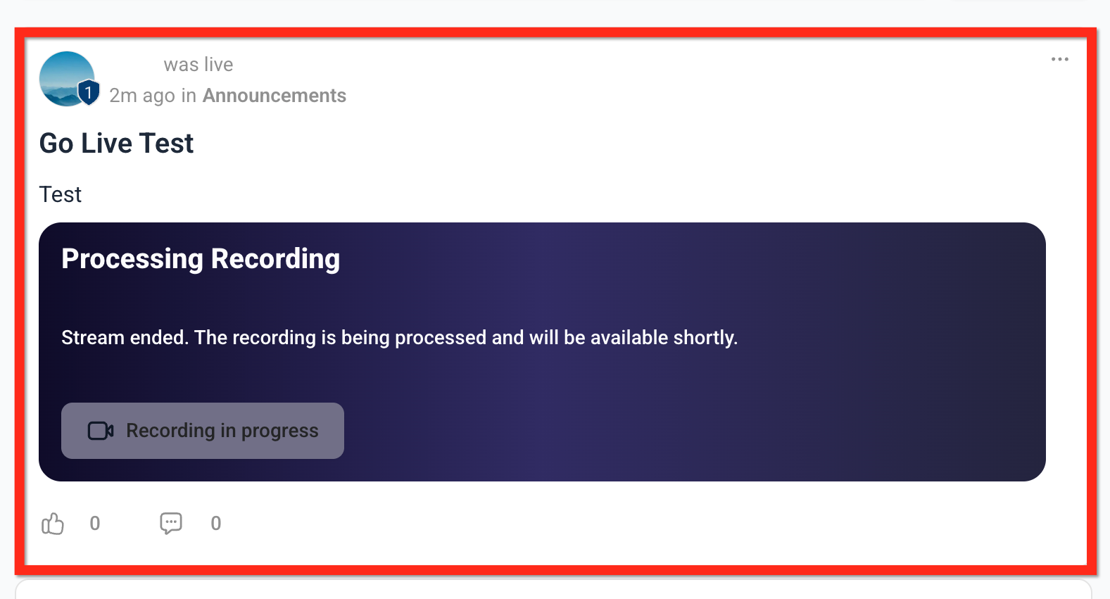After ending: A post appears in the selected channel. It shows that the stream ended and the recording is processing; once processed, the recording is available on that post.