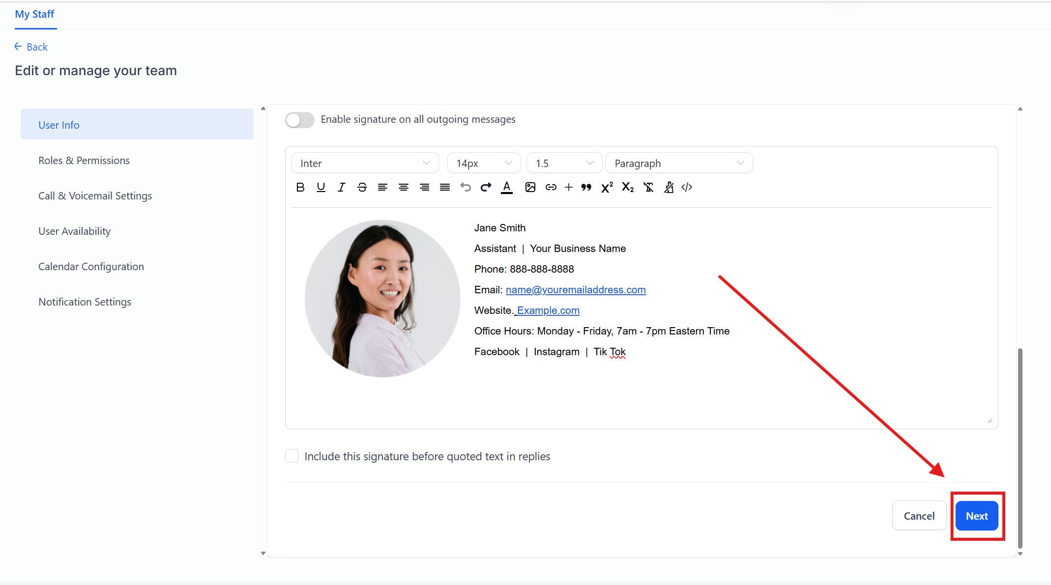 - Click 'Next' and then 'Save' to update the signature in your user profile.