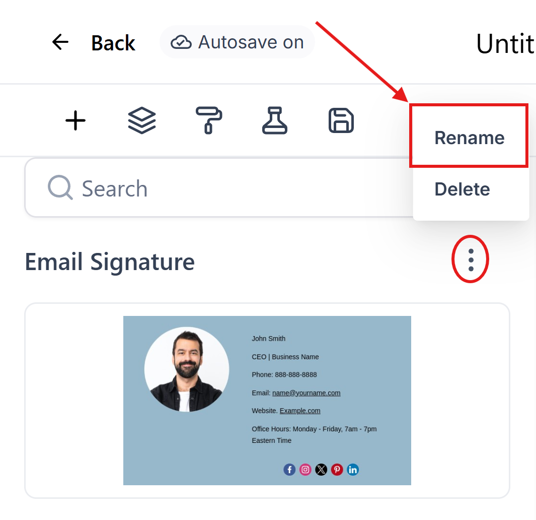 - Click on the three dots next to the saved section to rename it as your email signature.