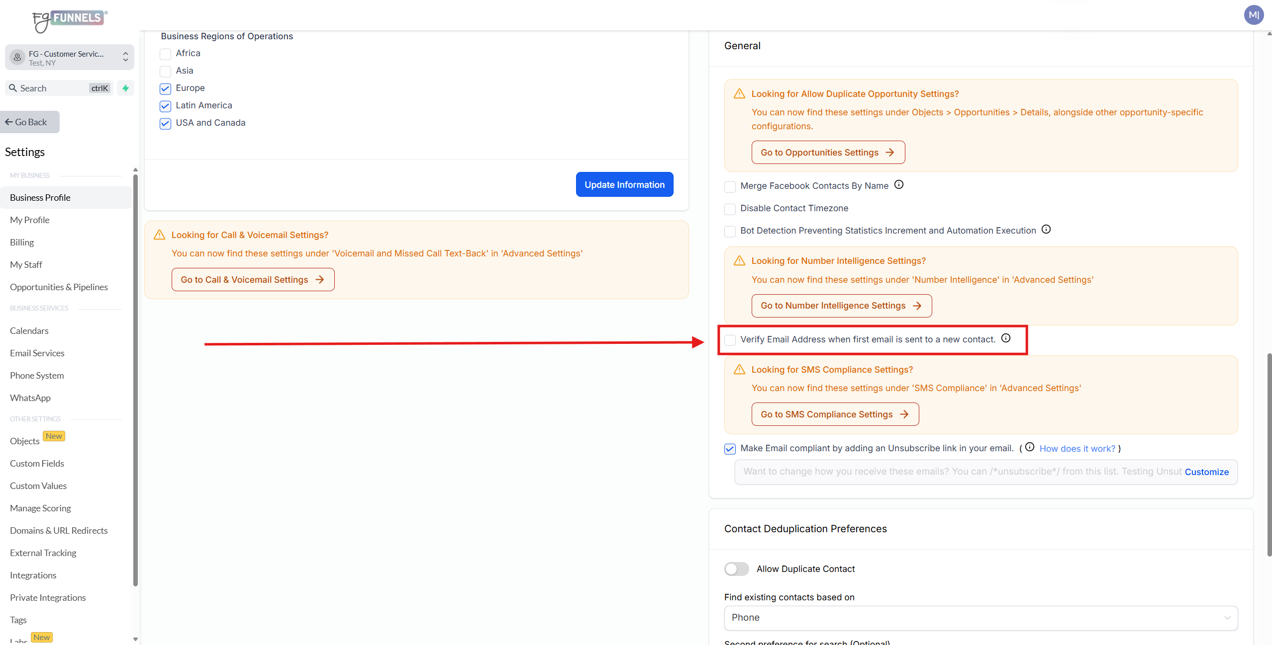 - Scroll down, in the General section on the right side of your screen, check the box next to the Email Verification feature, which will say "Verify Email Address when first email is sent to a new contact."