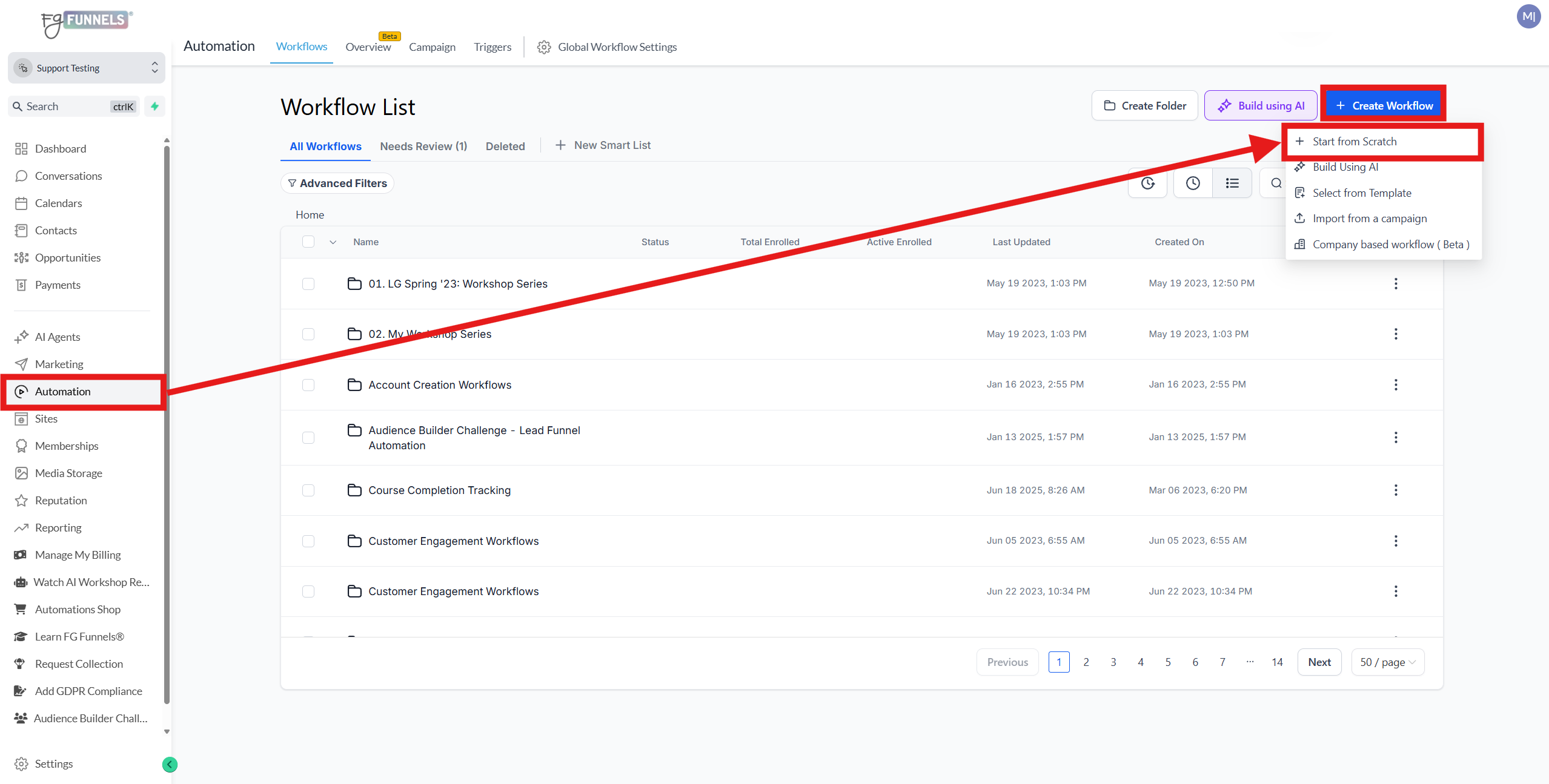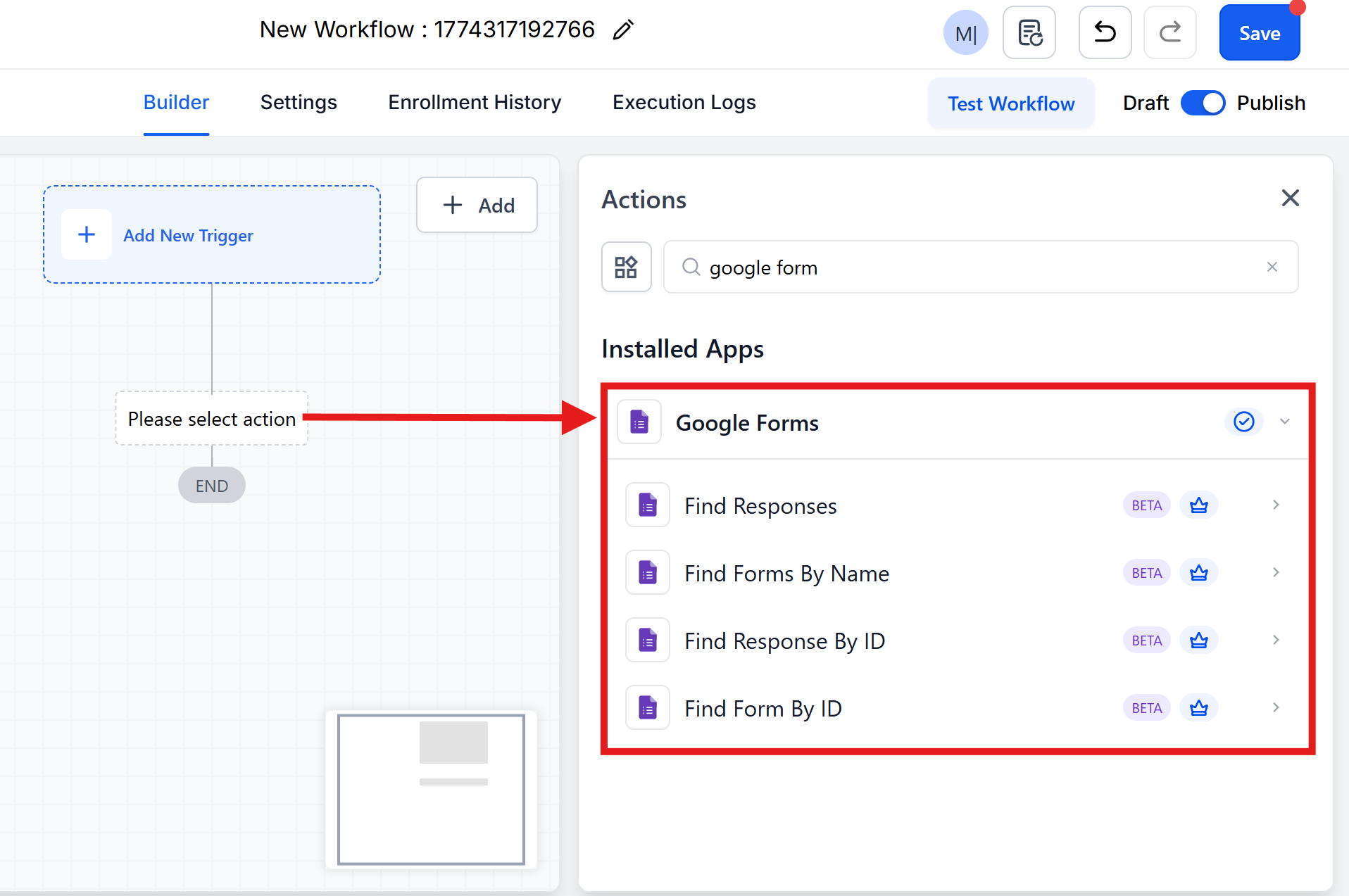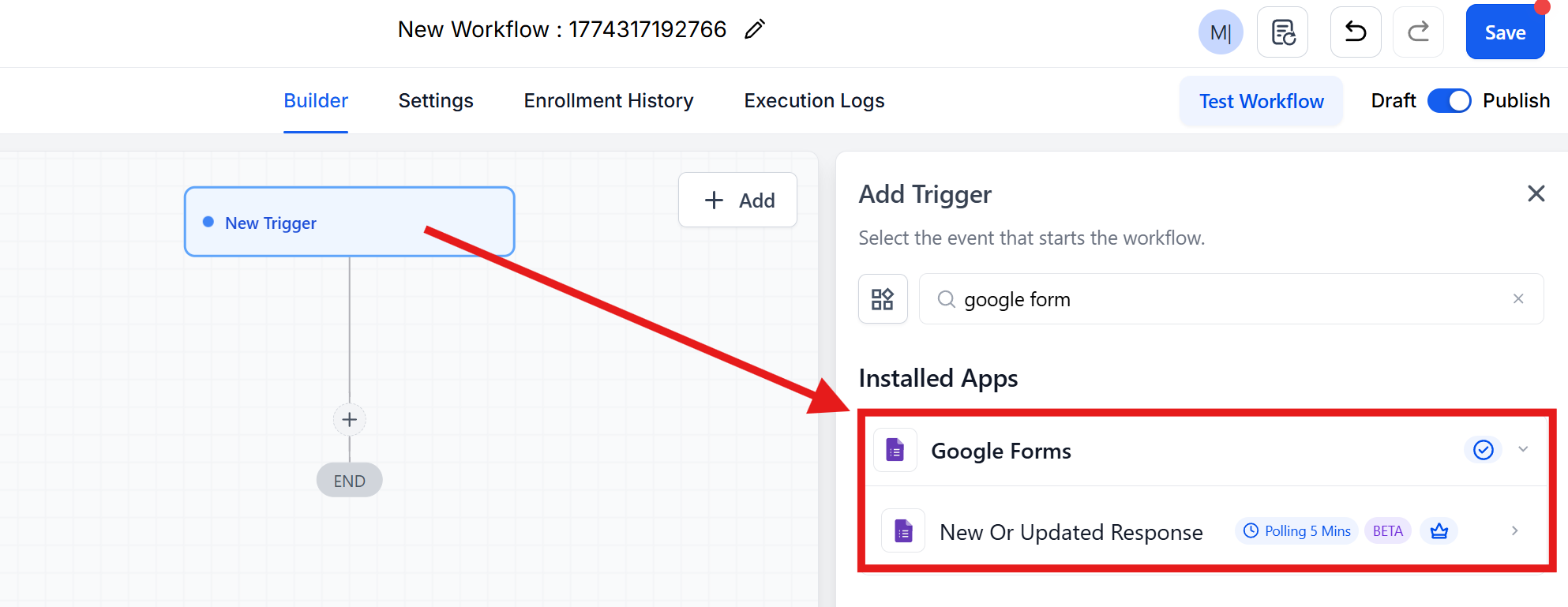 - Go to Automation > Workflows and begin adding Google Forms triggers or actions to your workflow.