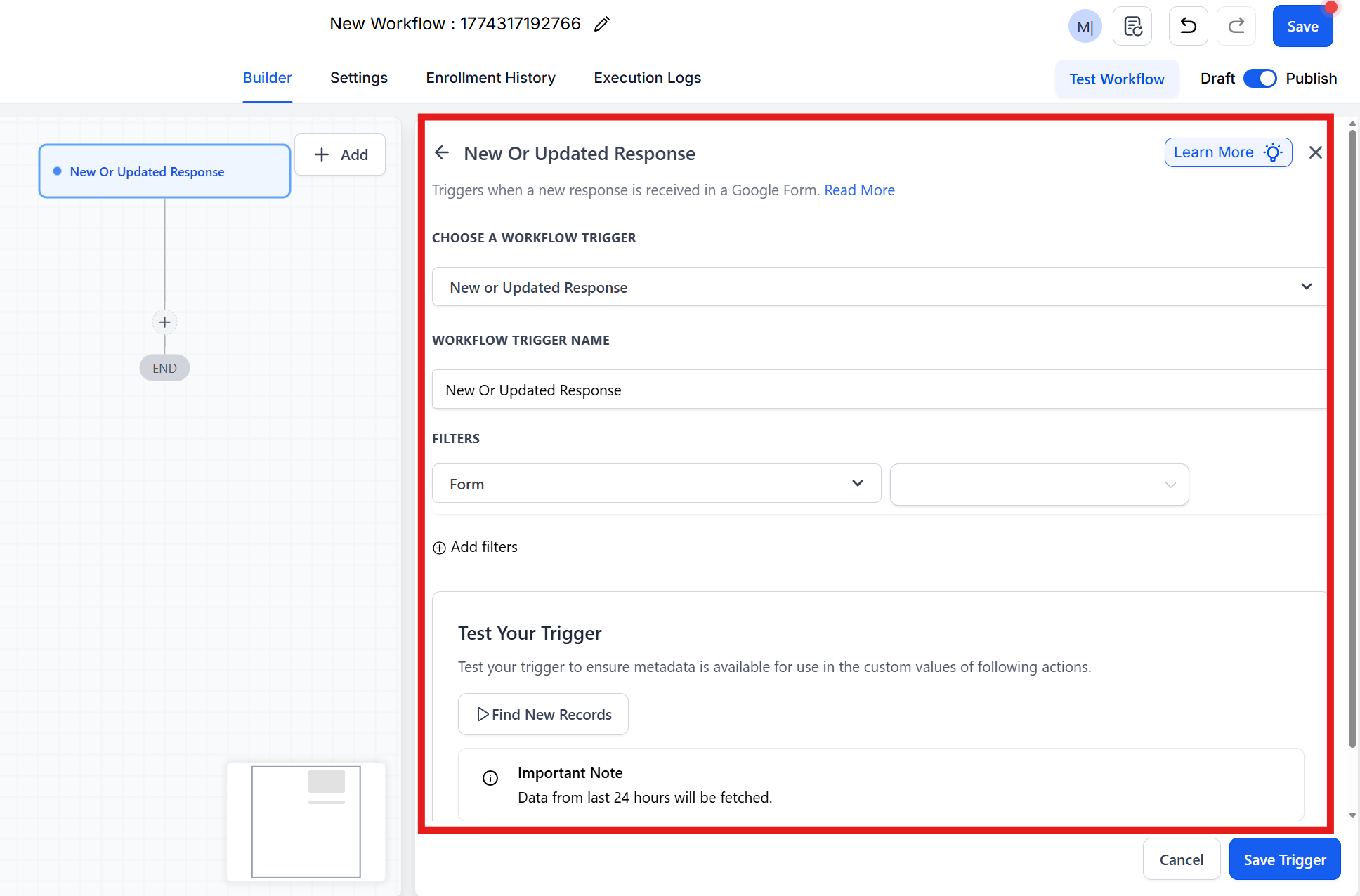 Google Forms triggers help you start an automation when a form response is received or updated. This is useful when you want the FG Funnels system to immediately begin a process after someone submits information through a connected Google Form.