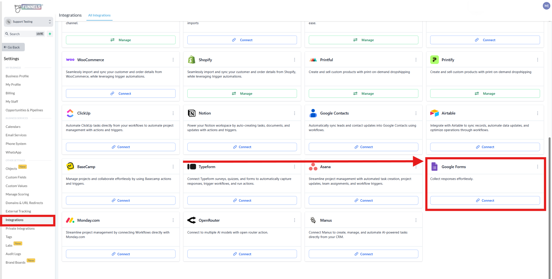 Before using Google Forms actions or triggers in workflows, the Google Forms integration must already be connected in the sub-account. Without this connection, Google Forms will not be available as a connected app when building workflow automations.