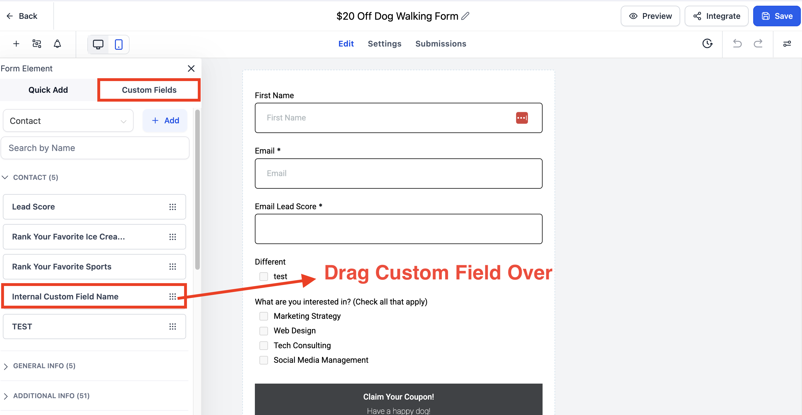 - Drag and Drop From the Custom Fields Section of Form or Survey Builder to Utilize the custom fields