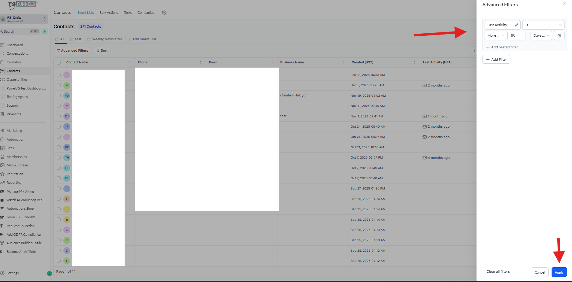 - Select the Last Activity filter. Once it is added, Select Last Activity > Is>More Than. In the Value field, type in 90. For the date unit, select Days. Then click Apply on the bottom right hand corner.